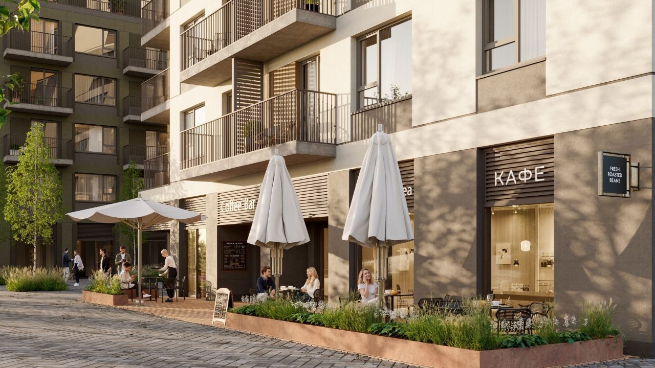 Территория Брусники разделена на несколько функциональных зон. Со стороны улицы Павленкова мы спроектировали фронт с коммерцией и приветственными площадями. На первых этажах домов — кафе, магазины, рестораны, кружки и образовательные студии. Под эти функции отведено 4 тыс. м2 — больше,чем во всём Эльтауне.